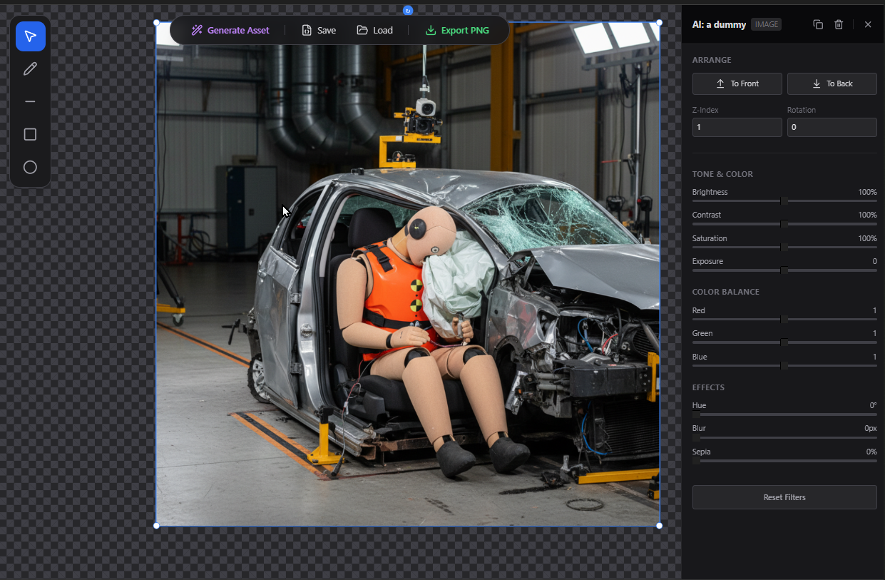 An infinite canvas whiteboard for drag-and-drop media composition with advanced color correction and optional AI image generation.